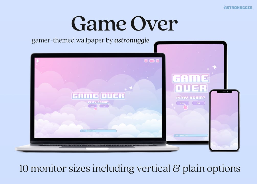 Get into the game with this 'Game Over' pastel-themed wallpaper! Each monitor size comes with the regular 'Game Over' version, and another without - for those who want to enjoy the wallpaper in a more simpler way.